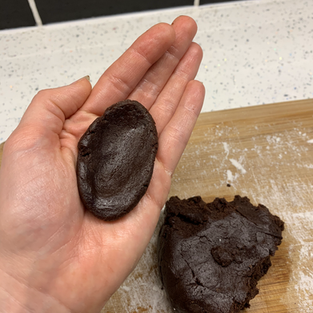 Once the dough has cooled down, tear off chunks and flatten it in your palm, take a small amount of ganache and place it in the middle and then gently wrap the dough around it (see below for pictures).